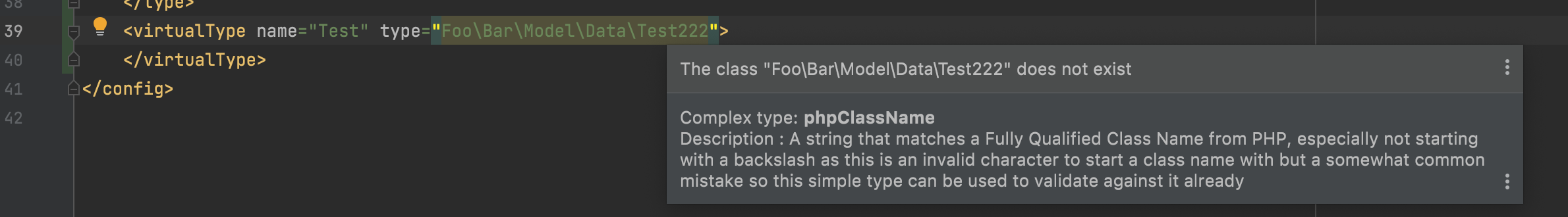 The Type tag inspections (in the di.xml files) detect empty values or invalid values where a Type values (class, interface, virtual type) are expected.
