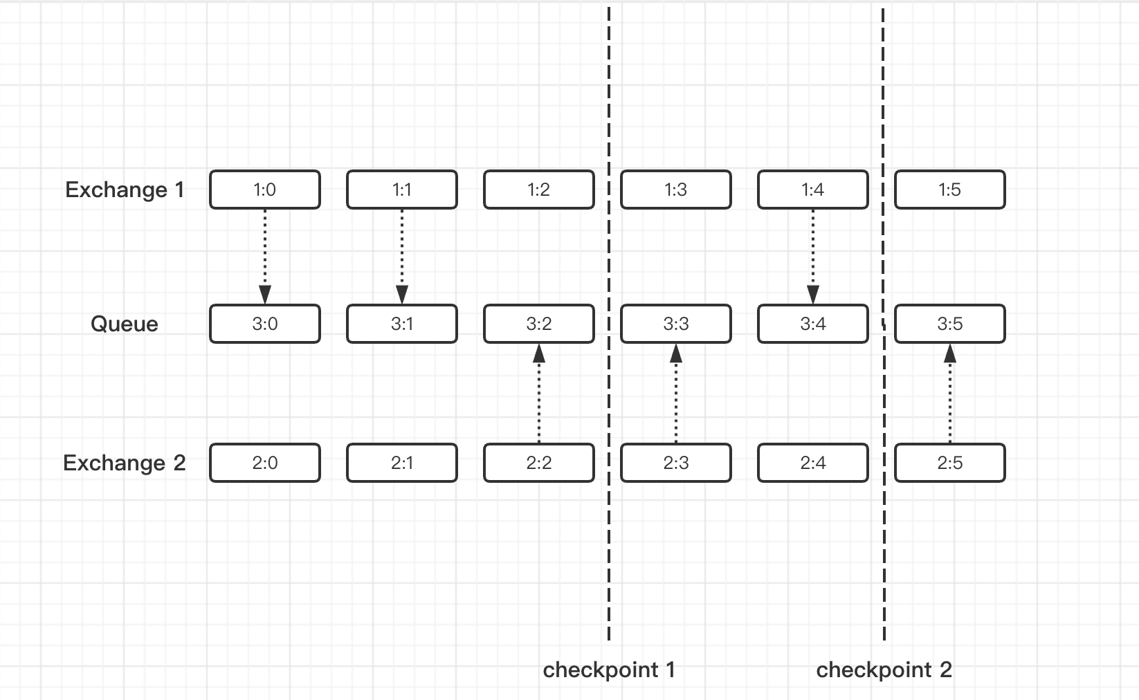 At checkpoint1, get the route mark delete position of exchange1 and exchange2, then get the last confirm position of the queue. The exchange1 route mark delete pos is 1:2, the exchange2 mark delete pos is 2:2, and the LAC of the queue may be equal with 3:2 or greater than 3:2 (because the routing message process is still running), when the mark delete pos of the queue reach the LAC at checkpoint1, it indicates that the index message 3:0, 3:1 and 3:2 were all acked, so we can ack the exchange1 with pos 1:2, and ack the exchange2 with pos 2:2.